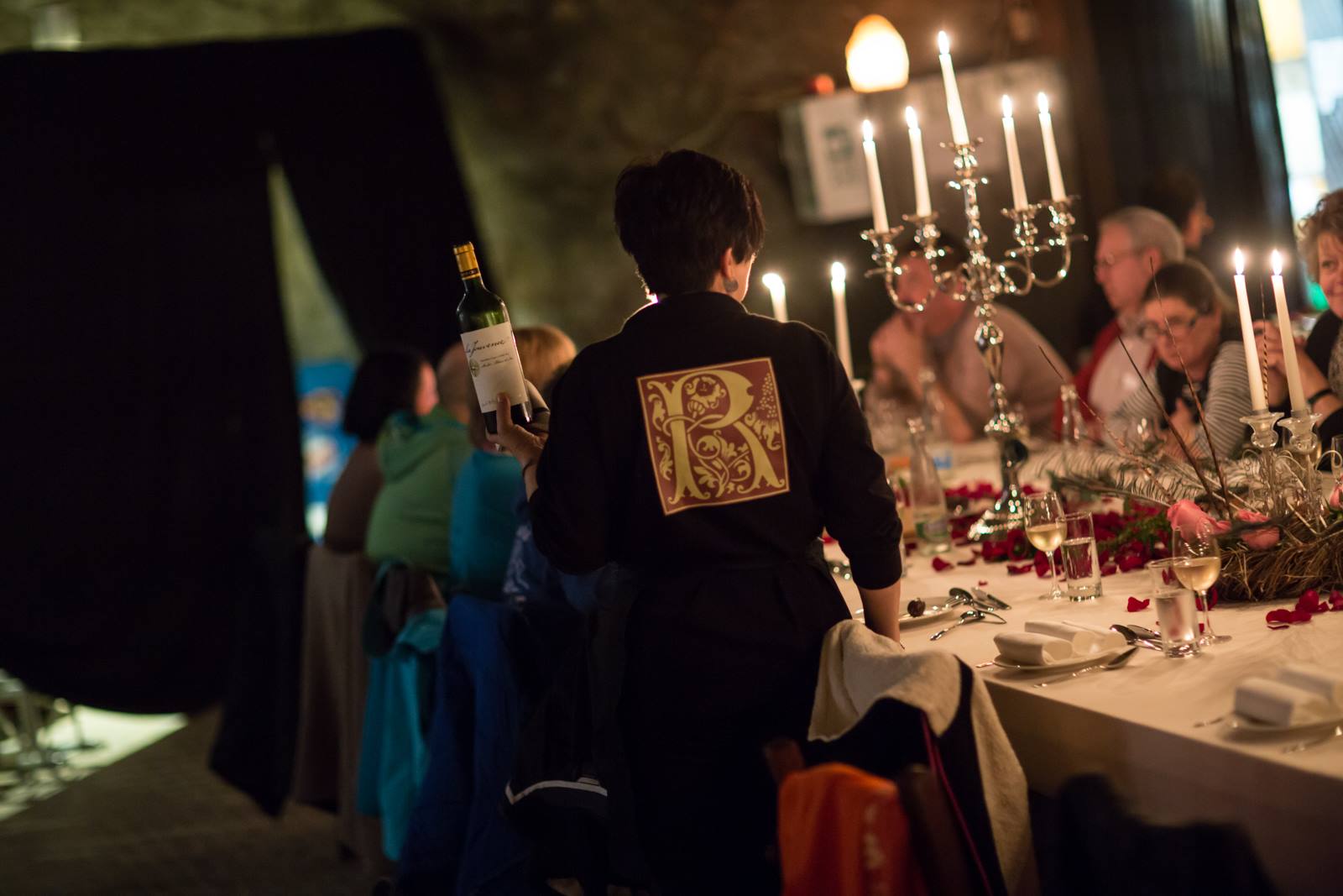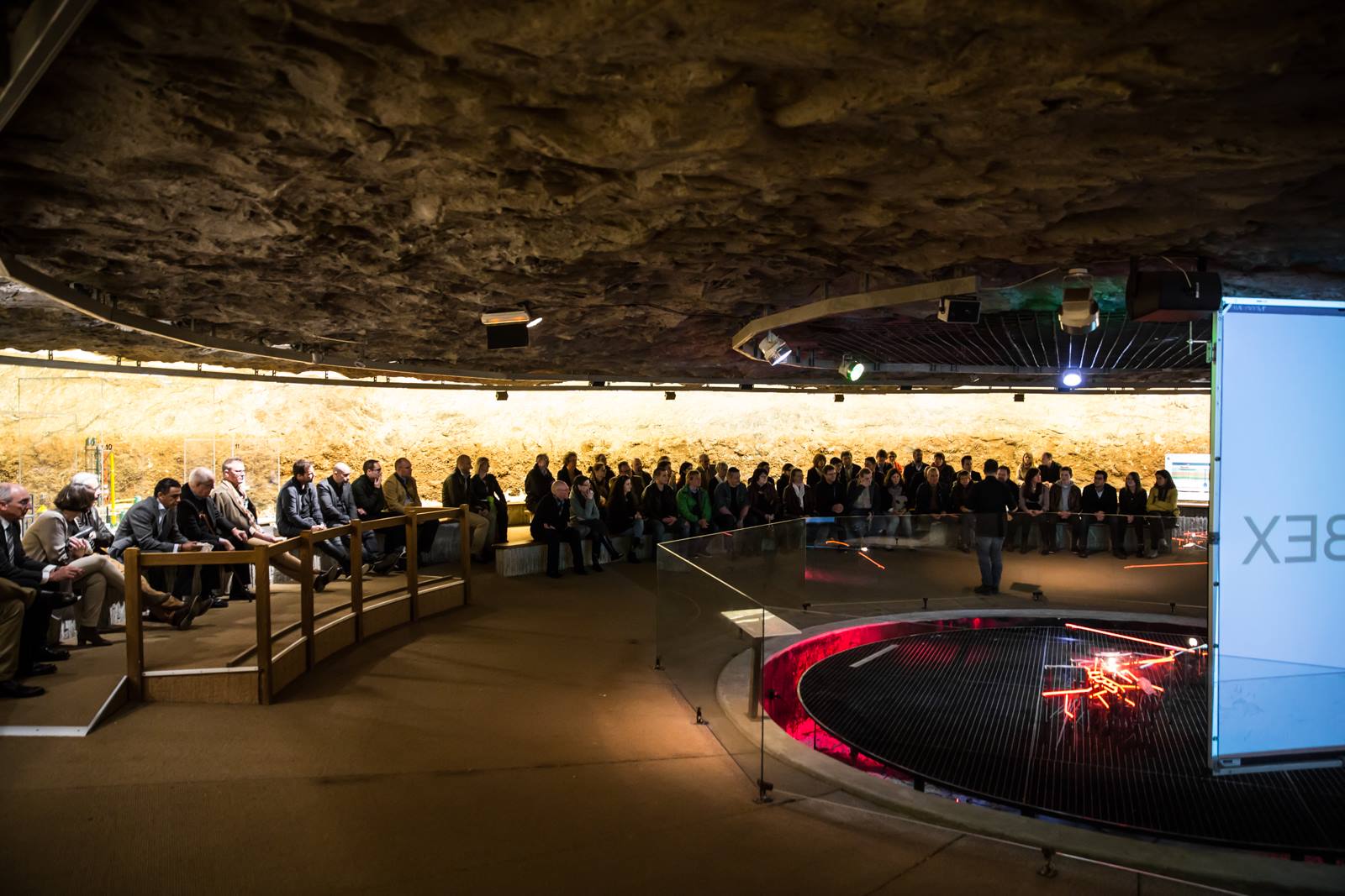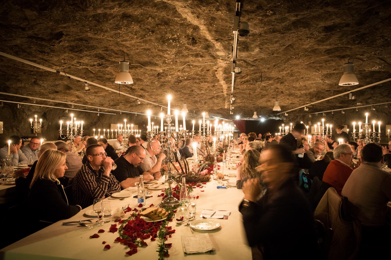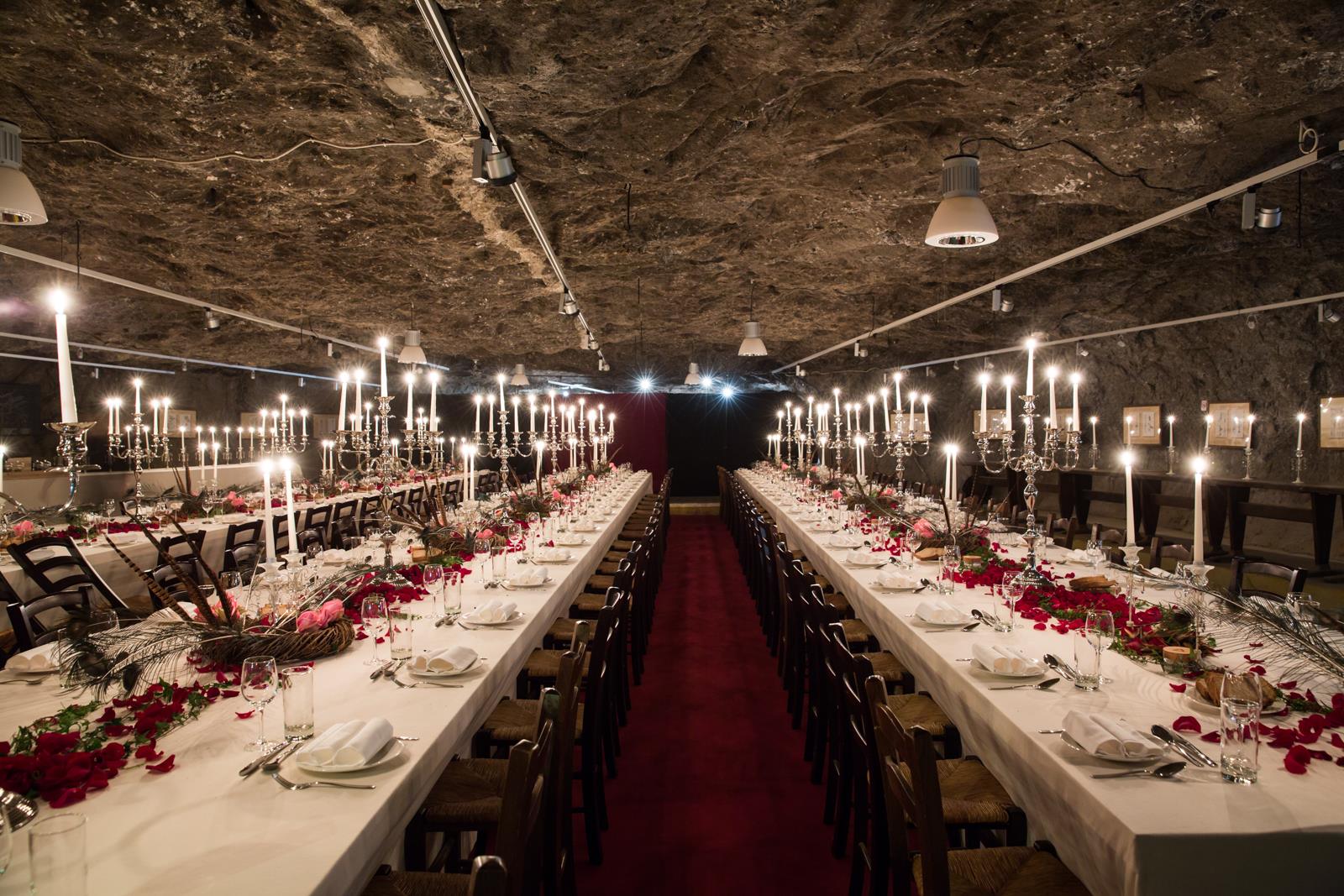Au plus profond de celles-ci, soit à 450m sous terre ! C’est alors, que nous avons dû prendre en compte cette configuration toute particulière : la seule salle capable de contenir les 120 personnes requises pour rentabiliser au minimum un tel défi ne pouvait être agencée que de 3 tables de 40 personnes chacune. J’en profite d’ailleurs, pour remercier tout le staff des Mines de Bex qui a réalisé un travail de logistique extraordinaire pour cet évènement ; les tables, par exemple. Par définition, une table de 40 places est forcément trop longue pour être acheminée par les petits trains de la mine. Il a donc fallut les dessiner, les réaliser à l’extérieur de la mine, puis les découper de sorte à pouvoir les remonter tout en bas !